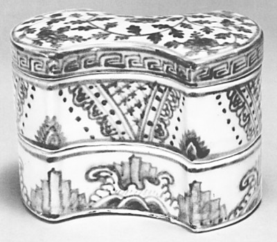 其三,银锭是人们向往的财富,糕点做成银锭形以求富贵吉祥,这种行为相对来说是世人喜闻乐见的。在古代,银锭的造型和图案十分流行,在房屋建筑、家用器具、服饰饮食等上面随处可见。饺子的形状就是模拟银锭而来,不过它模拟的是元宝形的银锭。清余治《得一录》卷三《育婴堂规条》载:“婴孩到堂……一一登明堂簿,即付乳妪收哺。收哺之后,顶发薙作锭胜模样,内外堂婴一体照办。”这说的是连孩童的发型也做成银锭模样。图3是上海闵行区塘湾镇莺潮村明代墓葬出土的青花锭形套盒,陈燮君主编《上海考古精粹》(上海人民美术出版社2006年)中介绍说:“锭胜形盒为明代出现的新器形,同元末明初的银锭十分相近,是模仿明代早期银元宝而作。”