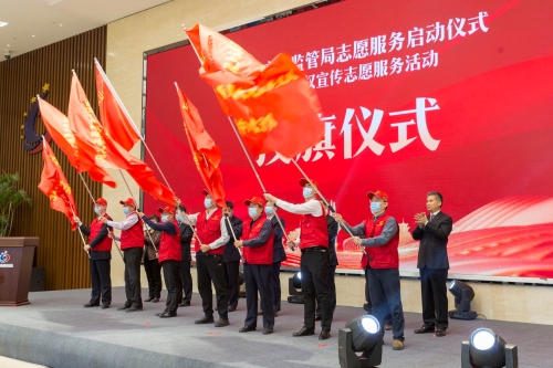 省委省直机关工委副书记、省直机关志愿服务总队总队长刘杰同志首先为省市场监管局志愿服务支队授旗,孙文利、刘杰、侯成君、朱昆峰、于智勇,以及全国劳模马凤志,省直机关文明和谐家庭代表孙树玲等7位同志为22个志愿服务分队授旗。随后,志愿者代表进行了宣誓并作表态发言,最后,侯成君同志宣布志愿服务活动正式启动。