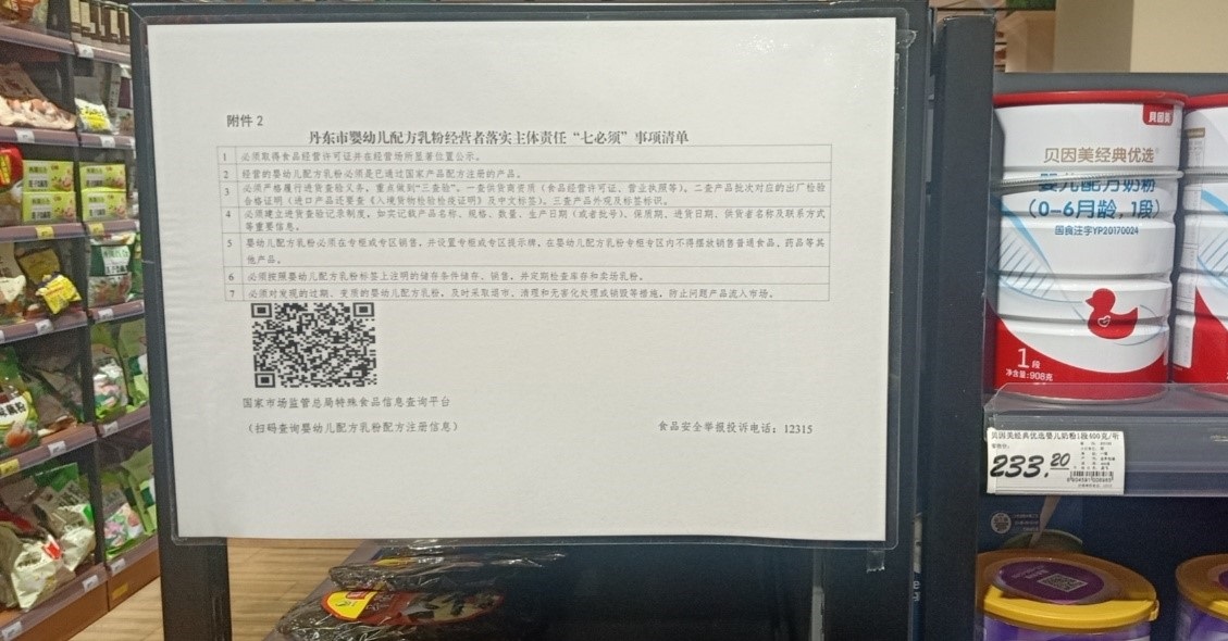 (图为丹东市婴幼儿配方乳粉经营场所张贴《婴幼儿配方乳粉经营者落实主体责任“七必须”事项清单》)