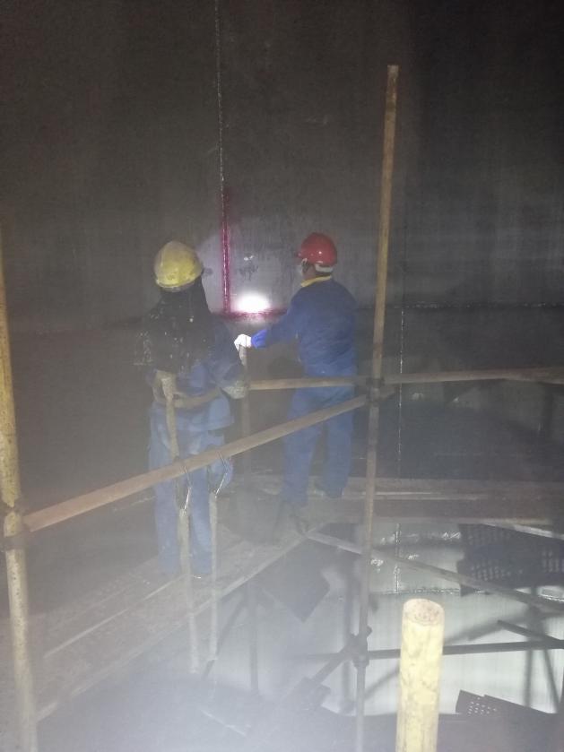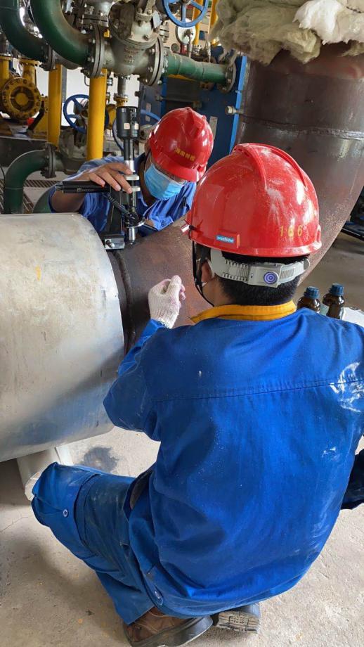 检验期间,洋浦经济开发区气温超过40℃,炎炎烈日照在身上令人难以忍受,持续高温给检验工作带来巨大挑战。检验人员无畏高温,一心想着为企业做好服务,5月6日抵达现场便马不停蹄地投入到紧张而有序的检验工作中去。他们仔细查看受检设备相关资料,与设备负责人充分交流,提出资料完善整改意见,随后迅速前往现场做检验前的相关准备工作。一切准备就绪后,检验人员按规程要求对容器内外壁、管道弯头进行测厚、无损探伤检验,无论是内部温度40℃以上的烘缸,还是42米高的高塔,检验人员都没有丝毫的懈怠,认真地按步骤做好检验工作。为了不影响企业的正常生产,检验人员顶着烈日,放弃休息时间加班加点检验,连续工作14天终于完成现场检验工作。