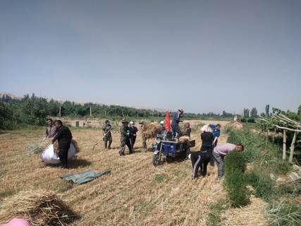 六月的天气高温炎热,在村民居米古丽·依马木和吐拉汗·祖伦两家的小麦地里,党旗和志愿者服务队旗迎风飘扬,党员干部积极投身到劳动中,有的在搬运小麦,有的在堆放小麦,还有的在往脱粒机上挑送小麦,大家干的热火朝天、汗流浃背,共同帮助两家困难家庭收割8亩小麦,彰显了党员干部吃苦耐劳、真心帮困的热情,充分发挥了党员的先锋模范作用。