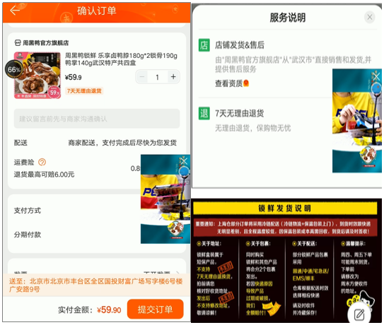 周黑鸭官方旗舰店 | 已公示 | 退货不成功 | 没发现 | 商品信息和订单页面标注“7天无理由退货”,但商品详情部分有提示锁鲜产品不支持“7天无理由退货”。最后退货不成功。 | ||