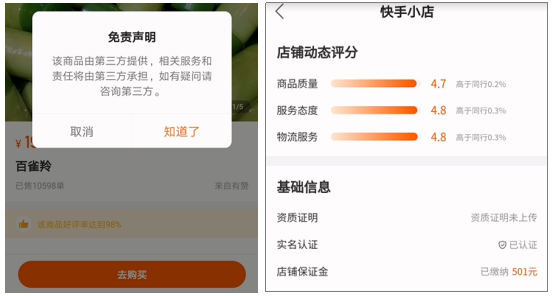 体验样本一:体验人员于2020年5月25日通过快手直播选购了一款“百雀羚水活能量修复精华液”,11瓶10ml装19.9元,主播介绍商品为试用装,提示介意试用装的不要下单。体验人员询问主播,如果对产品不满意能否退货?主播表示要退货就不要下单,退货要自己承担运费,商品金额小、快递费高不值得。体验人员选好商品点击“去购买”时,弹出免责声明“该商品由第三方提供,相关服务和责任将由第三方承担,如有疑问请咨询第三方”。平台商品信息未标注退换货信息。6月8日体验人员收到商品后申请退货退款。6月9日商家不同意退款申请,拒绝理由为“收到货联系我退款”,随后发送图片表示不影响二次销售,退货成功。