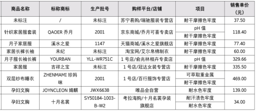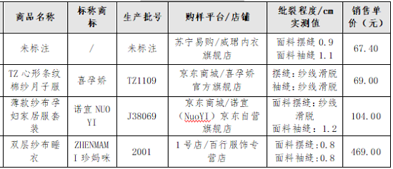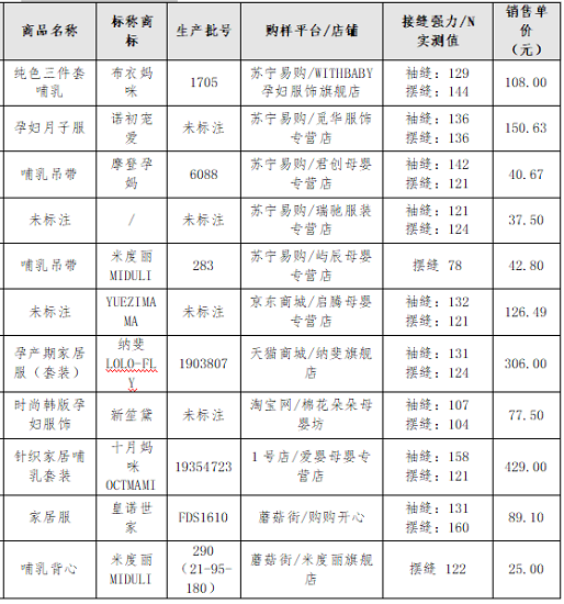 据介绍,本次比较试验的样品,由黑龙江省消协工作人员以普通消费者身份分别在淘宝网、天猫商城、京东商城、苏宁易购、唯品会等电商平台随机购买了80款样品,包括十月妈咪、全棉时代、南极人、爱慕、贝贝怡等消费者较为熟悉的品牌。其中哺乳家居服50款,哺乳文胸30款,购买单价从16.5元至688.85元不等。
