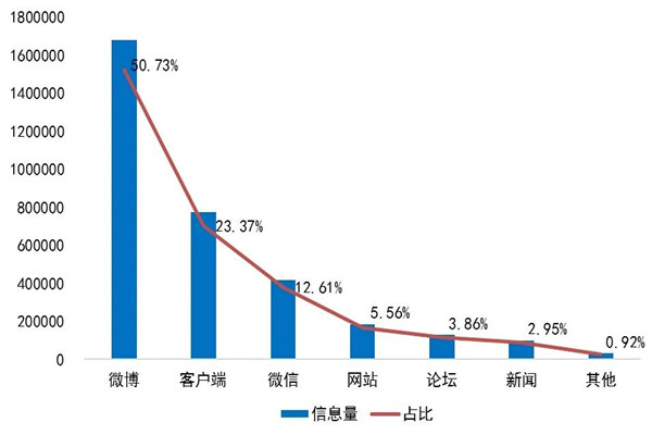 在信息传播渠道上,“五一”的“消费维权”类信息传播主要有微博、客户端、微信、网站、论坛、新闻等渠道。其中,微博信息量最高,占比50.73%;其次是客户端,信息量占比23.37%;第三是微信,信息量占比12.61%。