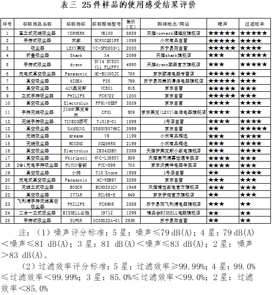 消费者在使用无绳吸尘器时需要近距离长时间握持机器,因此吸尘过程中机器噪声的大小以及是否能够高效过滤而无灰尘泄露,会影响消费者的健康和使用感受。因此,本次比较试验测试了样品在高档运行时的噪声以及过滤效率,25件样品的噪声最大为85.2 dB(A),最小为75.7 dB(A);过滤效率最高为99.998%,最低为67.125%。