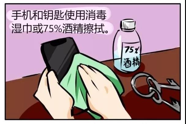 7.必要时消毒   回家后可以用消毒液或消毒湿巾,对门把手、钥匙、手机等物品进行擦拭消毒。