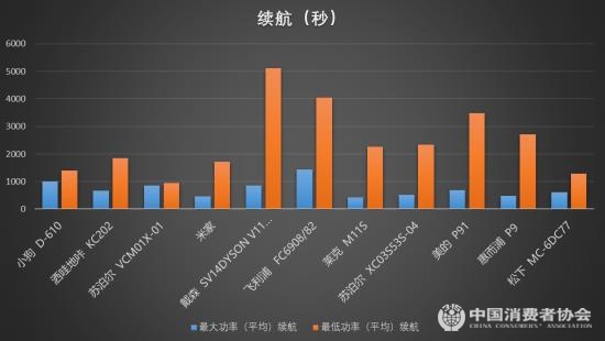 在开启最大功率时,11款无绳样品中,续航能力最好的是飞利浦 FC6908/82,达到24分05秒;米家、莱克 M11S、惠而浦P9 均只有7分钟左右。在开启最小功率中,11款普遍提升到20分钟以上,最长续航为戴森V11,可以达到85分钟。
