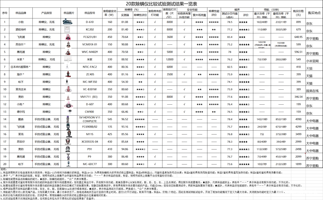 1.样品共计20款,均宣传具有除螨功能。其中标称为除螨仪类的样品为13台,带有除螨吸头的手持吸尘器类样品7台。