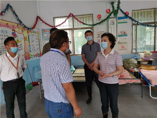 韩永生(右一)在枞阳县城关小学安置点了解灾民安置情况
