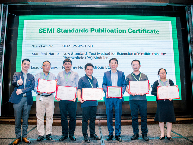 本次会议上,SEMI全球副总裁、中国区总裁居龙为天合光能、阿特斯、福建省计量院联合主编的《SEMI?PV94-0420,晶体硅光伏组件电池片缺陷电致发光测试方法》与汉能控股主编、福建省计量院等单位参编的《SEMI PV92-0120,柔性薄膜光伏组件拉伸测试方法》分别颁发了标准发布证书。上述两项标准的发布,为晶体硅光伏组件电池片缺陷检测和柔性薄膜光伏组件拉伸测试提供了重要测试方法和评判依据,填补了相关领域的国际空白,有利于国际光伏行业相关产品的质量提升。