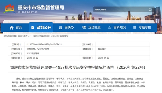 人民网北京7月3日电(欧阳易佳)据重庆市市场监督管理局网站公告,近期,重庆市市场监督管理局组织抽检饼干、餐饮食品、茶叶及相关制品等28类食品1957批次样品。抽样检验项目合格样品1941批次,不合格样品16批次。根据食品安全国家标准,个别项目不合格,其产品即判定为不合格产品。判定为不合格的产品,沃尔玛、永辉超市等有售。