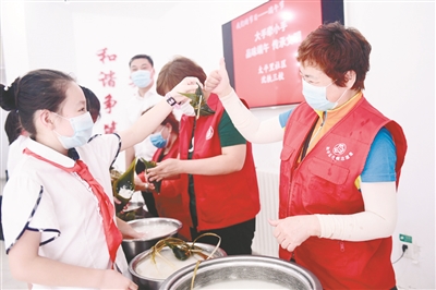 6月22日,一位老人为铁路五校教育集团新华街分校(沈铁三校)的孩子包的粽子点赞。当天,铁路五校教育集团新华街分校(沈铁三校)、和平区太平里社区举行“传承端午文化 助力品质社区”主题活动,大家通过包粽子、网上端午传统文化课等形式,传承民俗文化。(张文魁)